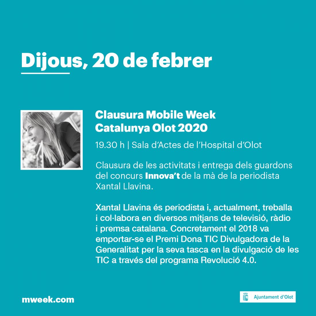Clausura de les activitats i entrega dels guardons del concurs Innova't de la mà de la periodista Xantal Llavina. Xantal Llavina és periodista i, actualment, treballa i col·laora en diversos mitjans de televisió, ràdio i premsa catalana. Concretament el 2018 va emportar-se el Premi Dona TIC...